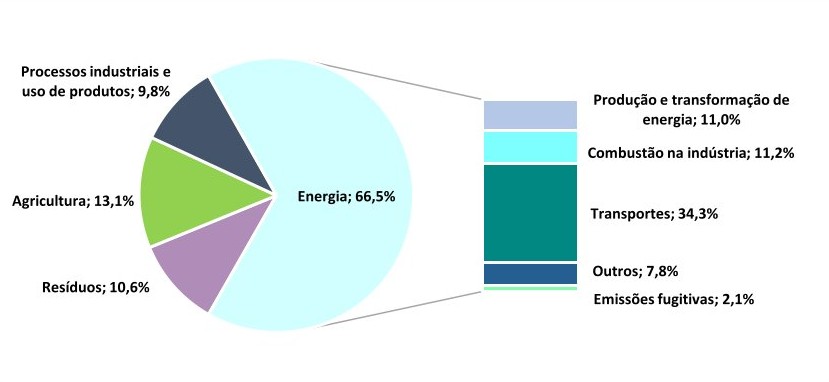 - As emissões do setor da “Energia”, em particular, apresentaram, em 2023, a seguinte distribuição: “Transportes” – 34,3%, "Combustão na indústria" – 11,2%, “Produção e transformação de energia” – 11,0%, “Outros” – 7,8% e “Emissões fugitivas” – 2,1% do total de emissões nacionais.