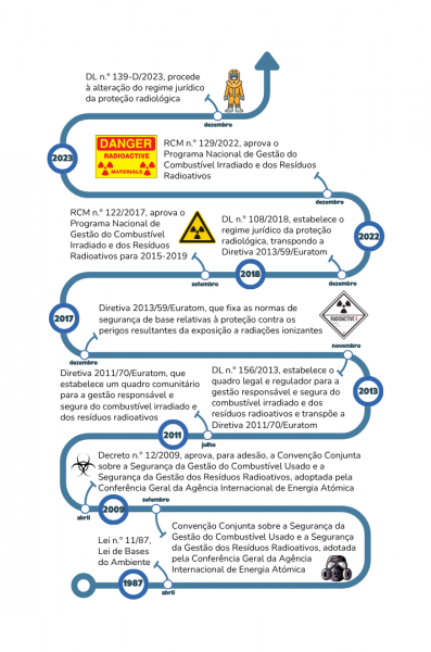 O enquadramento legal deste tipo de resíduos é completado com a Resolução do Conselho de Ministros n.º 129/2022, que aprova o Programa Nacional de Gestão do Combustível Irradiado e dos Resíduos Radioativos (PNGCIRR), e com o Decreto-Lei n.º 139-D/2023 – que estabelece novos valores de isenção, liberação e exclusão.